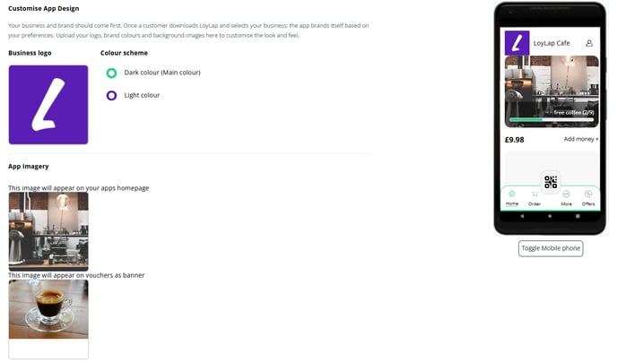 Next click on 'My App' so you can configure how your business will appear within LoyLap. We'll go through each step so you can configure the appearance to be on brand with your business. You can use the preview on the right hand side as a reference.