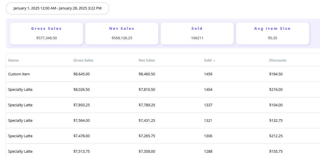LoyLap 'Item Report' allows you to filter by date/time and location to perfectly understand your product sales volumes and amounts.