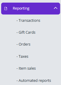 The REPORTING tab allows you to access various different reports about your business. be this for specific transactions, Online Orders, Gift Cards, Taxes or Items. Within each of your reports there will be extra filters to ensure you are getting the information you are looking for.