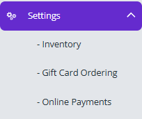 The SETTINGS tab allows you configure options for new Inventory items, as well as Order Gift Cards & Connect a payment gateway for customers to top-up, Order Digital Gift Cards and Order Online.