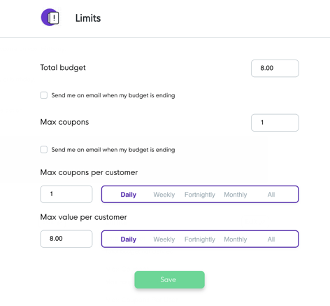 For the limits, you can set the max budget per customer.