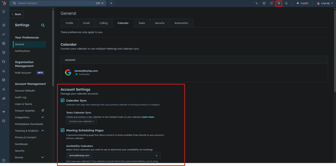 1. Ensure Hubspot is configured to integrate with Google Calendar. When logged into Hubspot click the cog wheel in top right to take you to settings. Click the Calendar tab and ensure the Calendar Sync and Meeting Scheduling Pages is ticked and the dropdown is configured to your email address.