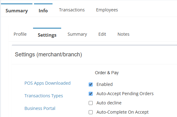 The other setting you'll want to enable is Auto Accept.This can currently only be completed on the Admin Portal (for the experiences interface). This will need to be set on the Branch. Search for the Merchant group in question and then click on then. Then go into Branches and click on the Experience branch. Then you'll want to go to the below page and ensure the boxes are ticked.