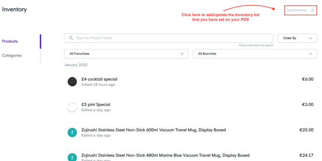2) The inventory should perfectly mirror your POS inventory, however if you have recently added products to your POS inventory, please click 'Synchronise' to update/sync your inventory list with your POS