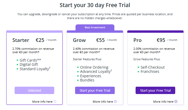 Once you have finished inputting the detail about your business you'll be taken to the pricing pages where you can find a choice of available plans,these will be the same as those listed on the intitial pricing page