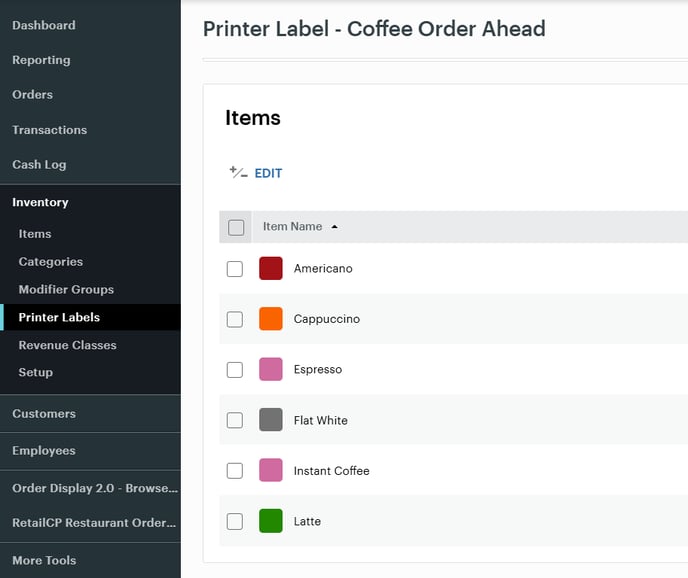 2) Once the Labels have been created then the appropriate items will need to be applied to these labels. This can be completed in bulk via the Clover Dashboard by access the Printer Labels and then Editing the Label in question. A list view of the inventory will be visible, so tick the items that need to be applied to the Label.