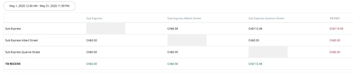 The branch names are listed on the left hand column and are also the column headings. These allow you to see in which locations that have had a card sold in one and then redeemed in another. The top line advises the overall value to pay to the franchisee locations, totaled under the 'To Pay' collumn and the amount each location is set to receive is outlined on the bottom line titled 'To Receive'. It is down to you as a business as to how you wish to reconcile these and pay the franchisees in accordance to these loads and redemptions.