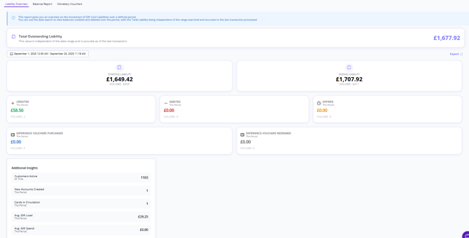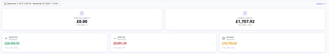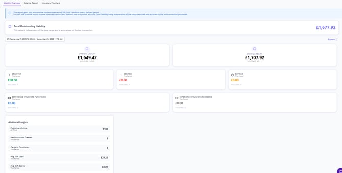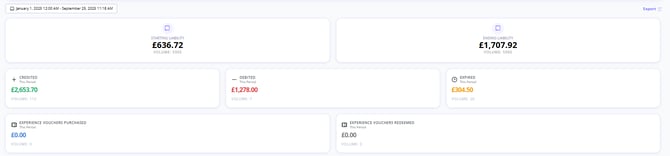 3) The Credited, Debited & Expired values as they appear are the amounts credited and debited within the input date range. This is how the change between your starting & ending liability is calculated. The expired value here represents cards that expired within this date range. These are active fields and will update depending on the dates you want to report for. If we run the same report but from January 1st to current date you can see the values update. It is worth noting that the credited amount does not include Single use Experience Vouchers. This is because they are treated as revenue on the date they are purchased. You can read more about the terminology here.