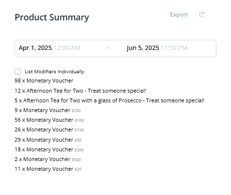 5) There is a Product Summary option in the top right of the screen. This will open a new menu to show a list of the Experience Vouchers sold during the report period.