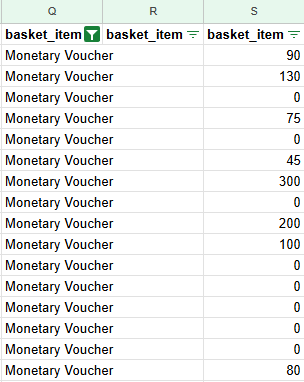 Once you open the file you'll see each of the sales. You can the filter this export by column Q for the basket items to get the specific type of voucher you are looking for, in this example we'll filter for Monetary Vouchers. You can then use this combined with column S for the Basket Item to see the total value of the vouchers sold.