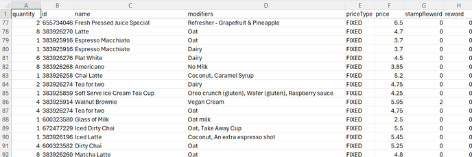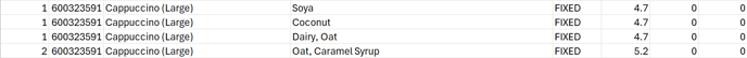 You'll see from this export that it breaks down the Cappuccinos into different lines that show the modifiers that were used each time these were ordered: